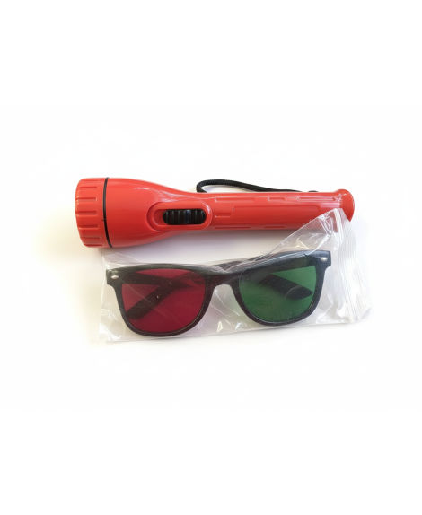Linterna de Worth. Se utiliza para evaluar la fusión plana del paciente. La linterna contiene los 4 puntos de Worth y una gafa Rojo/Verde
